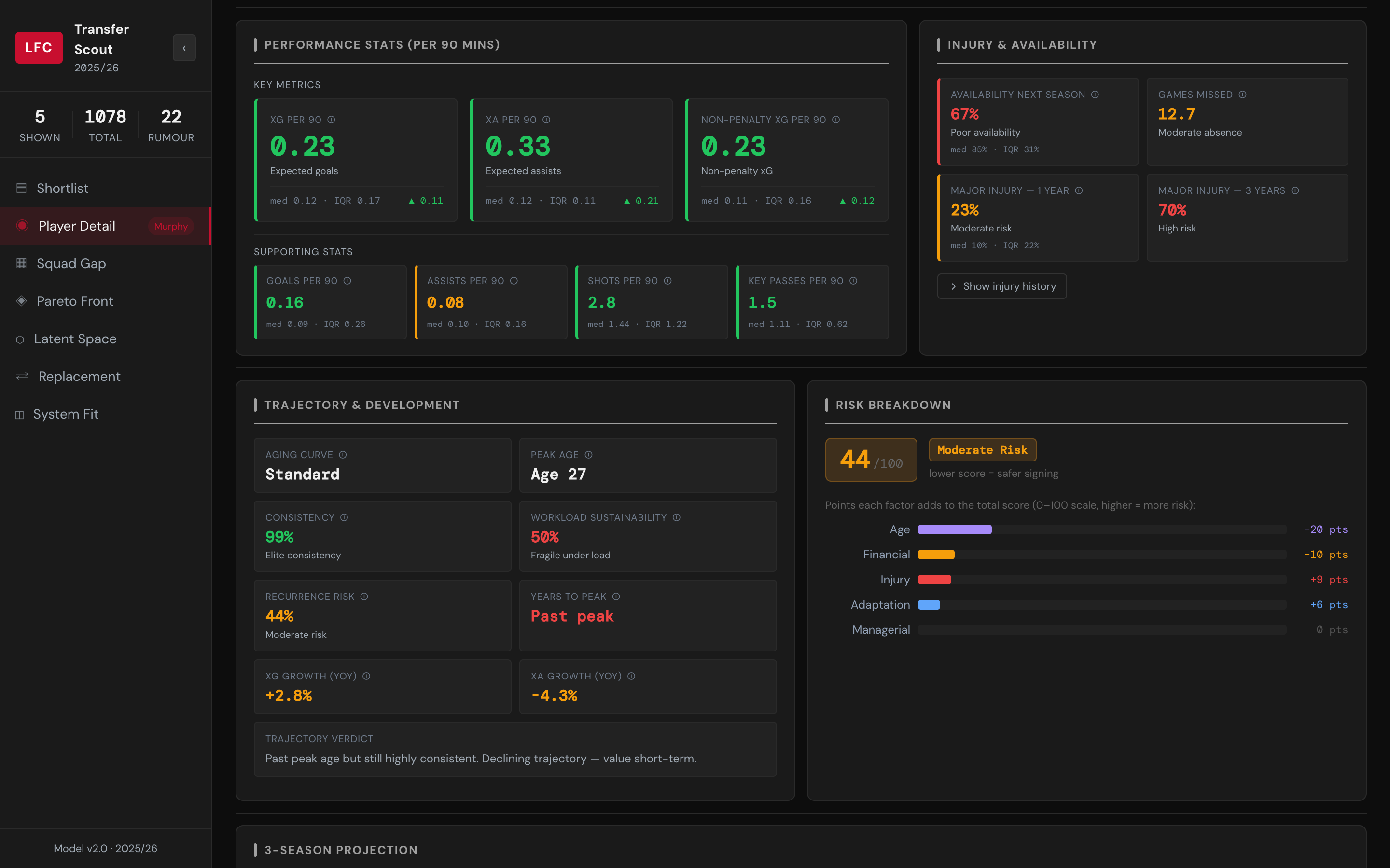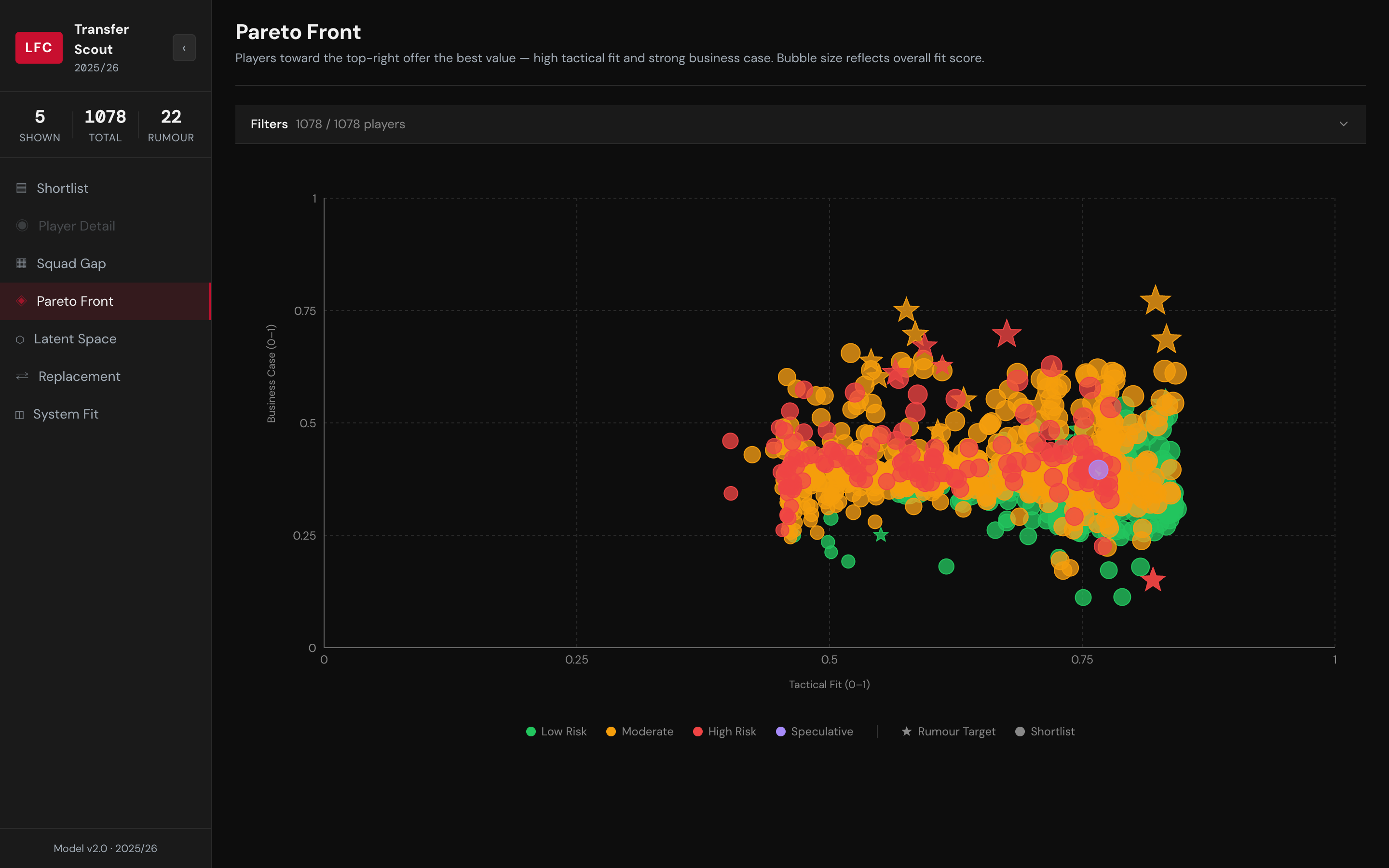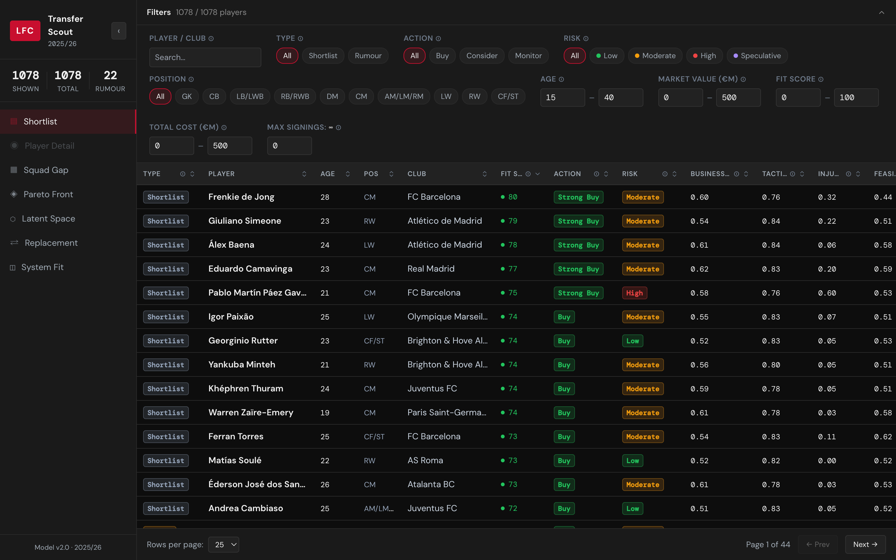 Filter 1,000+ players by position, risk, market value and tactical fit score across every major league.